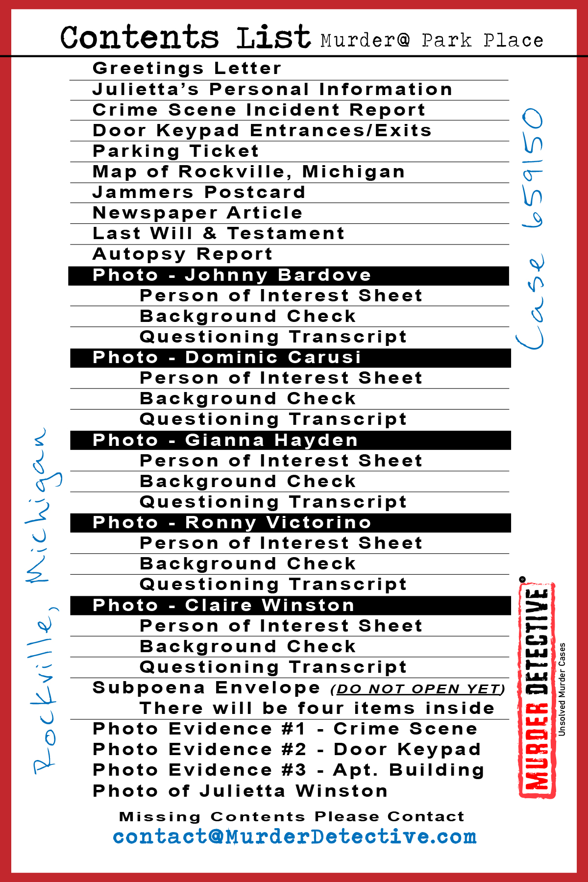 ObjectivePlease read over the evidence files & photos provided in the case folder. Use this information to unlock the subpoena's in the subpoena section below. You may visit the subpoena page link below at any time. PLEASE DO NOT OPEN THE SUBPOENA ENVELOPE YET. Visit the Subpoena link below to learn how to gain access to that envelope